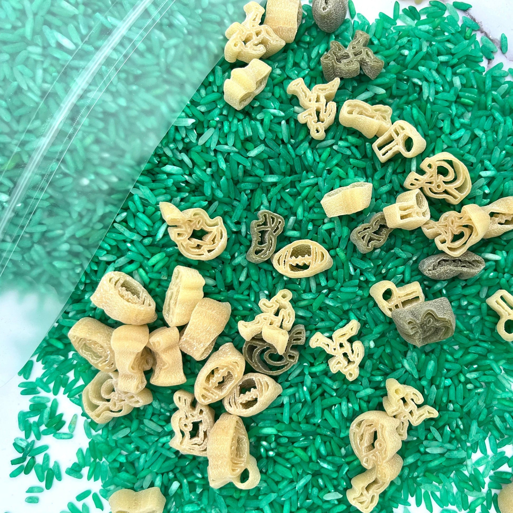 *Rice is dyed with liquid watercolor. Do not play with or in water. Dye may come off on hands if hands are wet