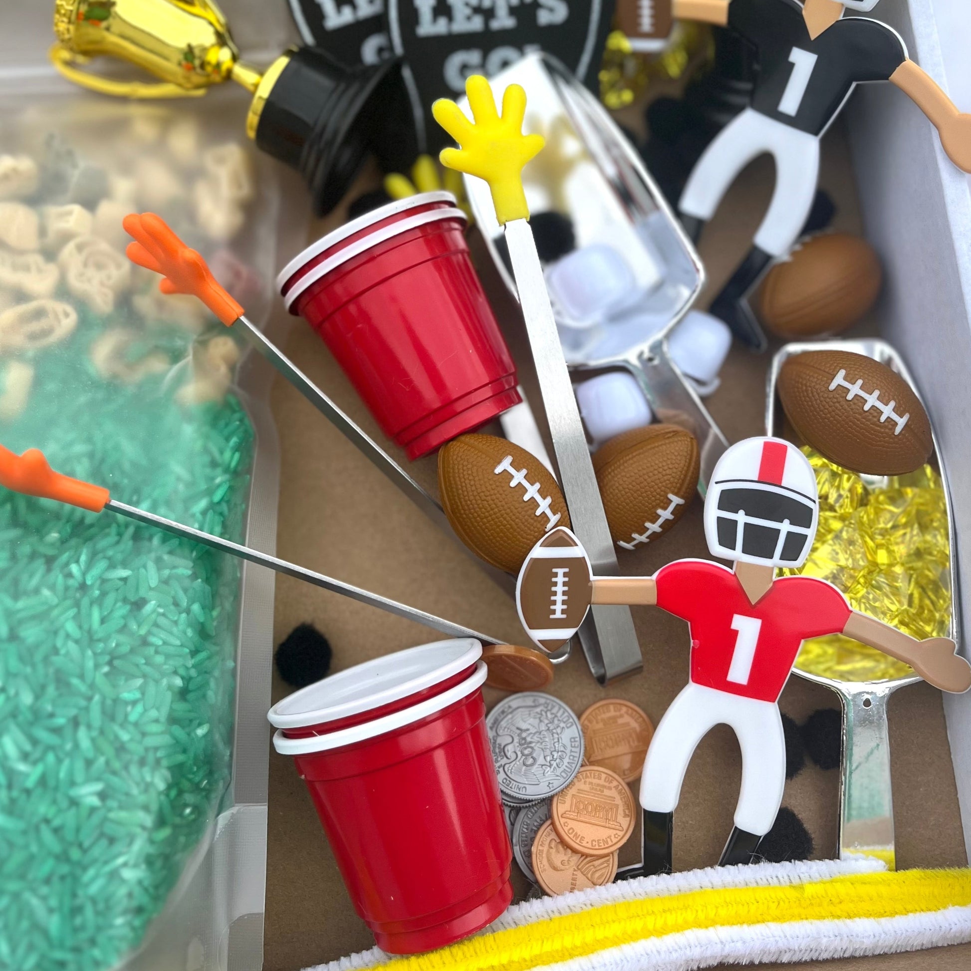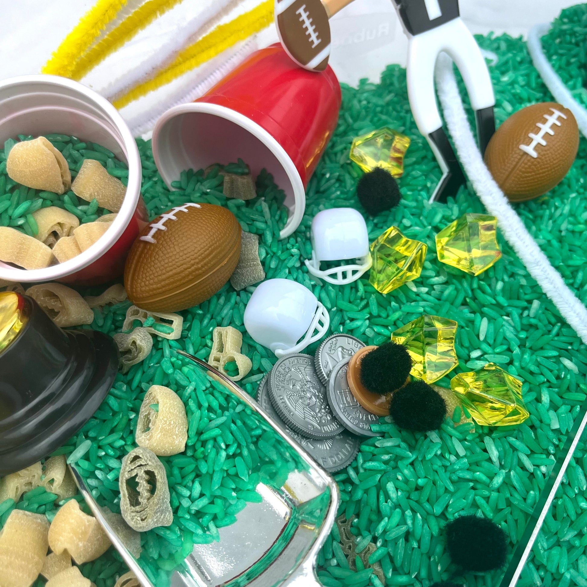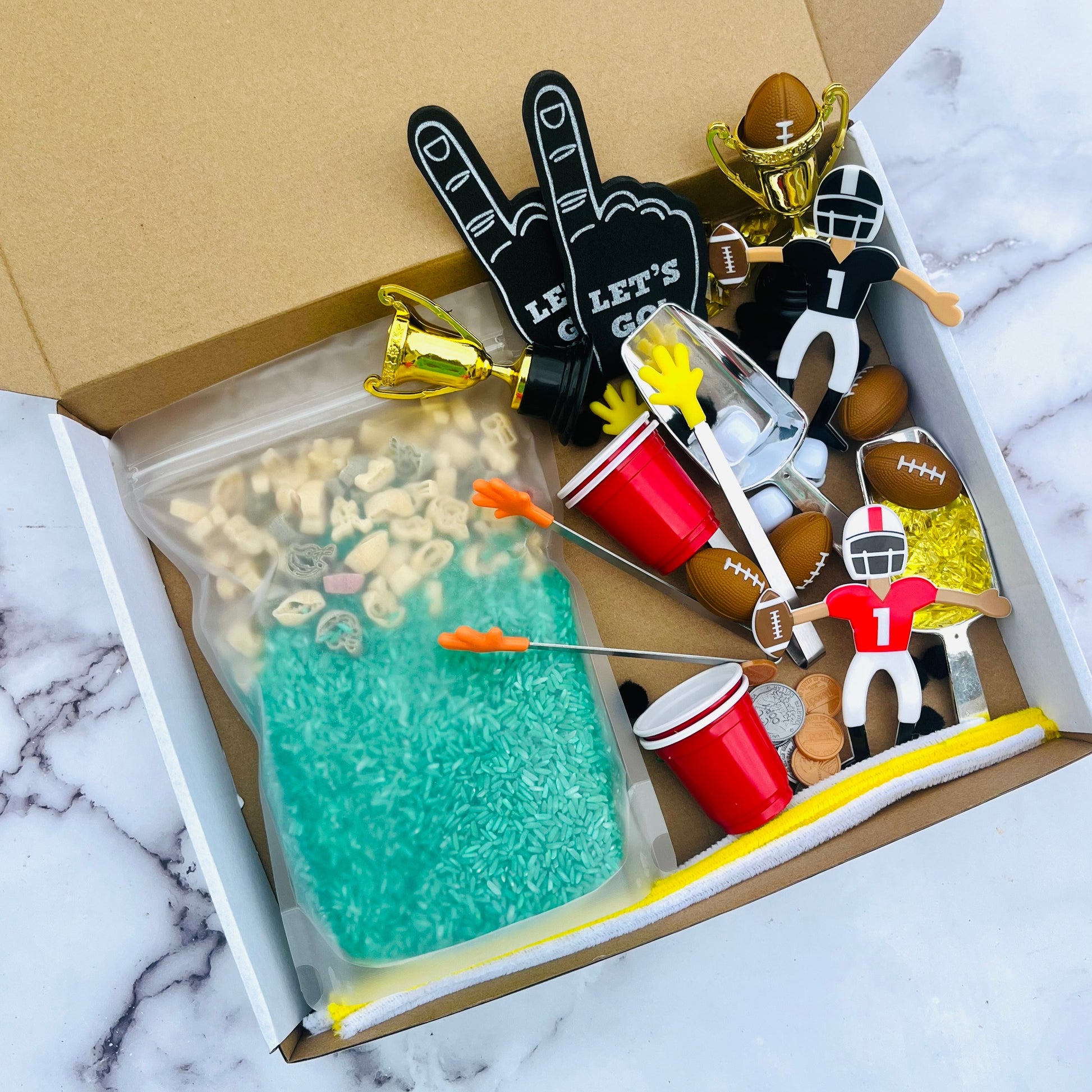 This Football Sensory Kit is the perfect creative activity for football coaches' kids or football-loving kids! This fun rice activity set has lots of football-themed accessories for kids to enjoy. Help bring out the creativity in your football-loving little ones with this fun and imaginative kit. Sensory kits will encourage imaginative play while improving fine motor skills, language development, and curiosity.