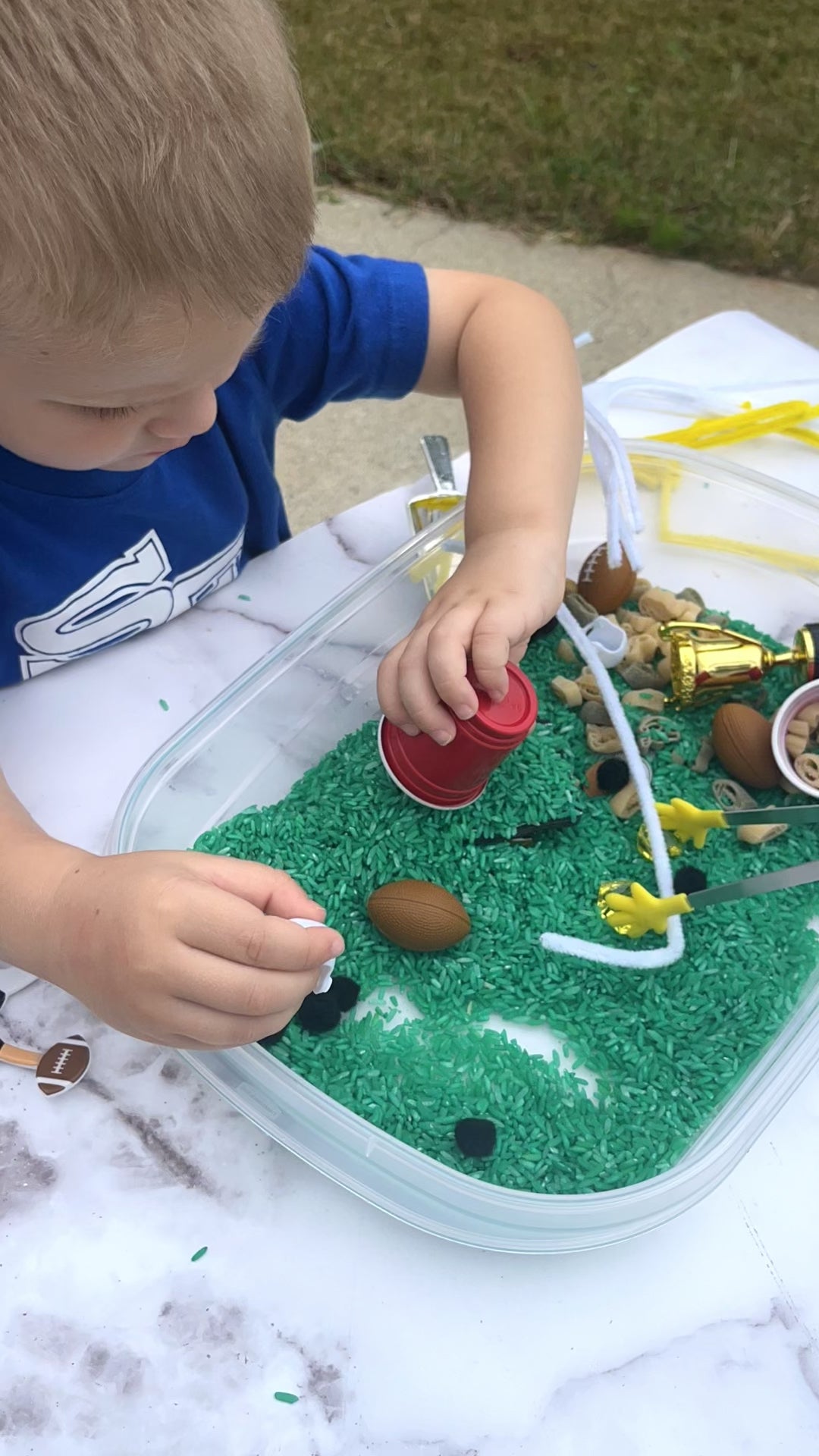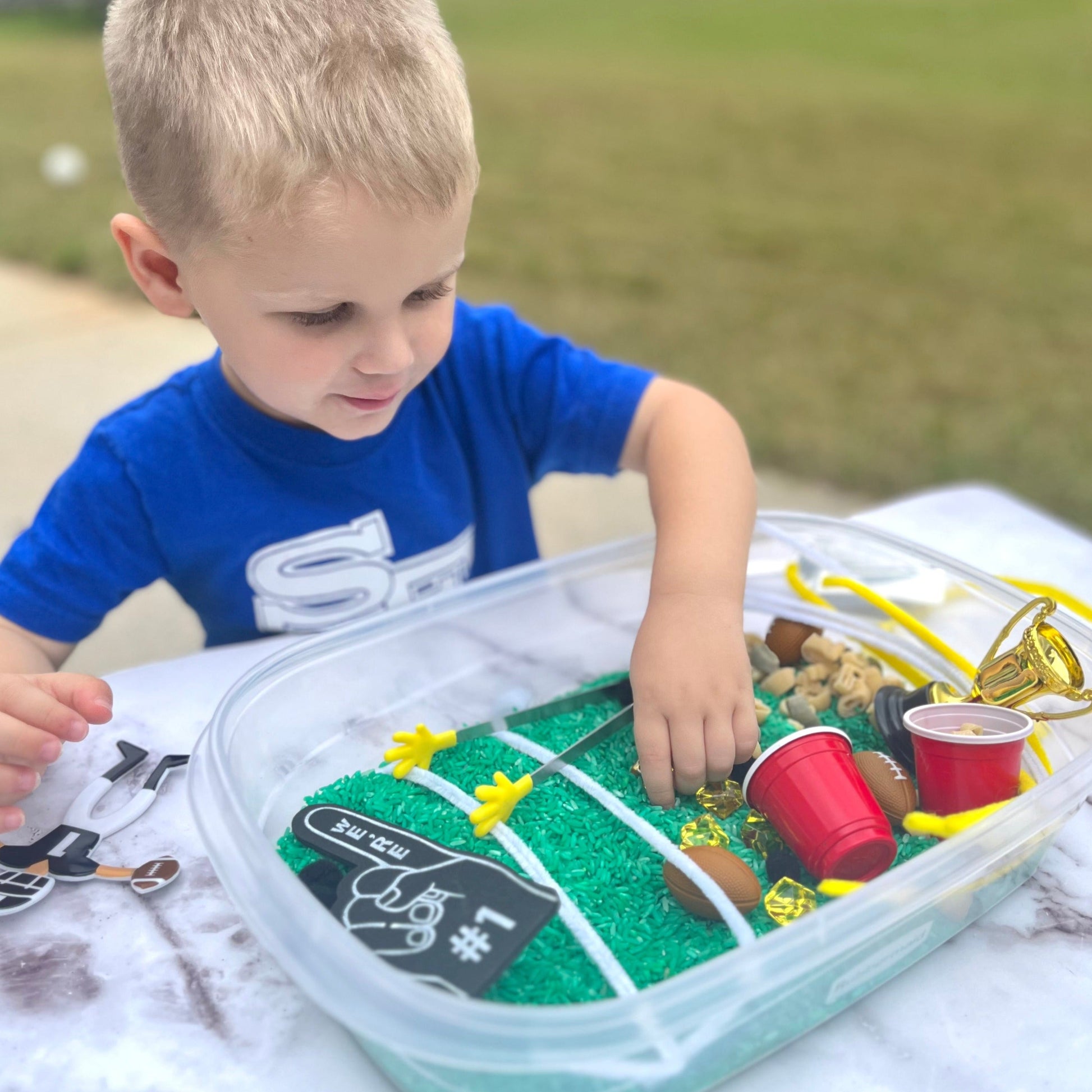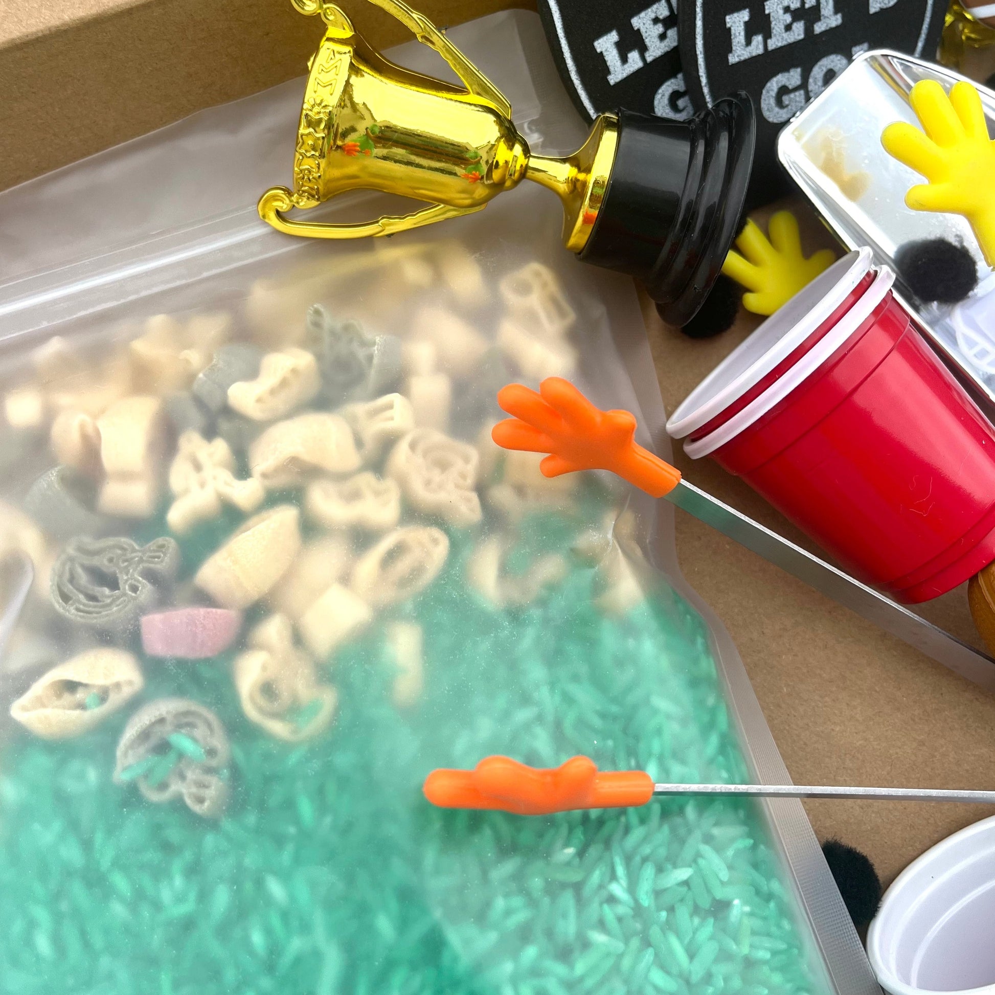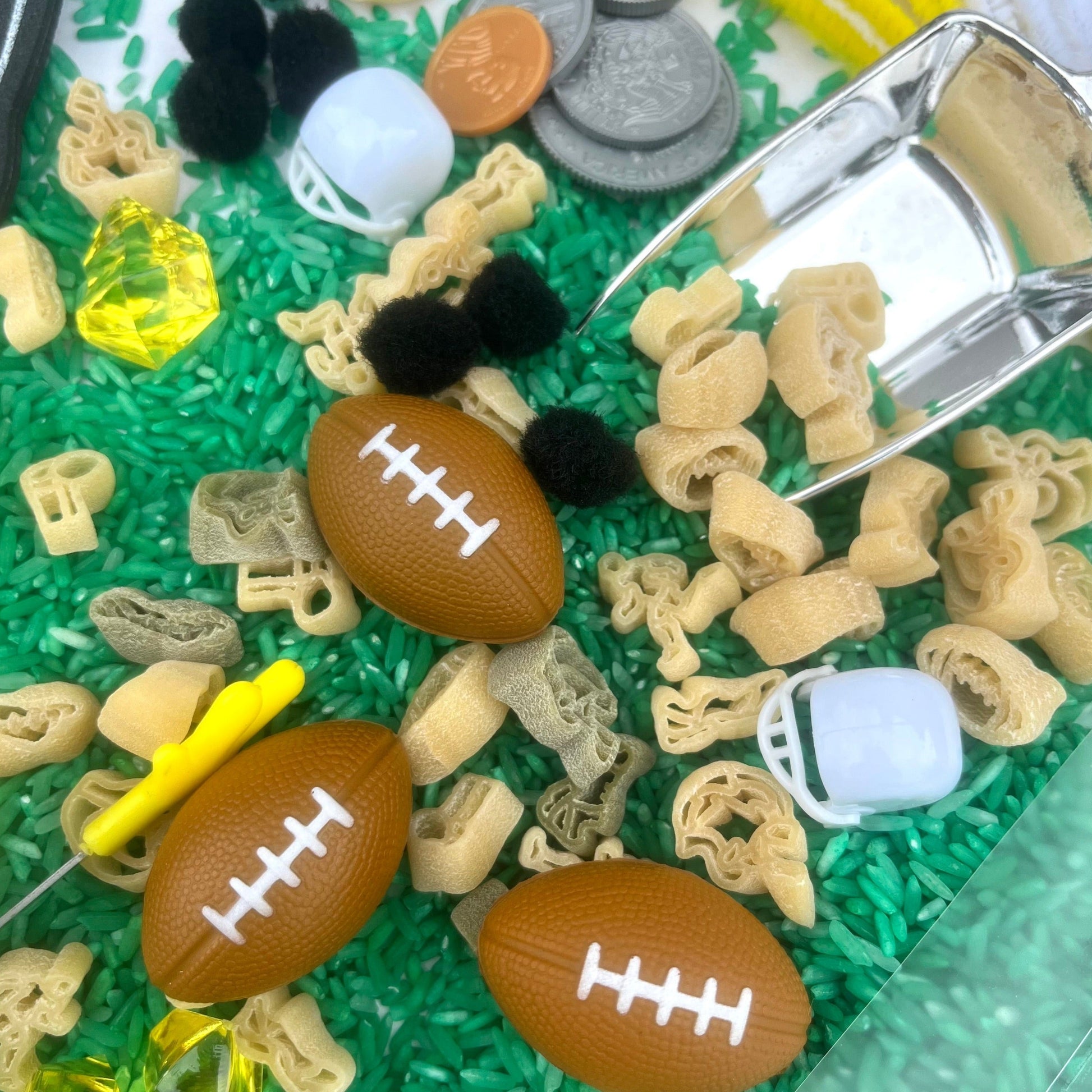 This Football Sensory Kit is the perfect creative activity for football coaches' kids or football-loving kids! This fun rice activity set has lots of football-themed accessories for kids to enjoy. Help bring out the creativity in your football-loving little ones with this fun and imaginative kit. Sensory kits will encourage imaginative play while improving fine motor skills, language development, and curiosity.