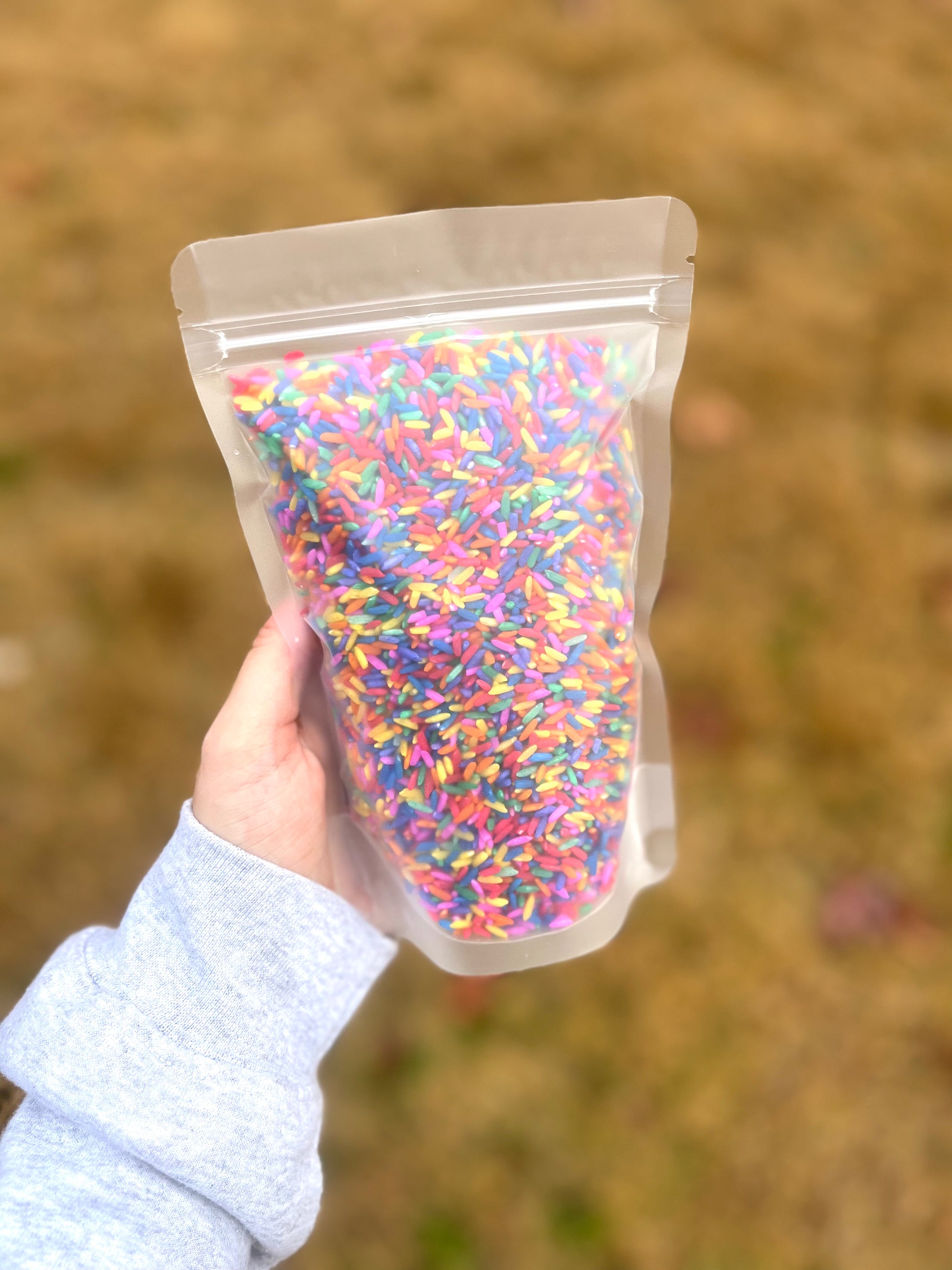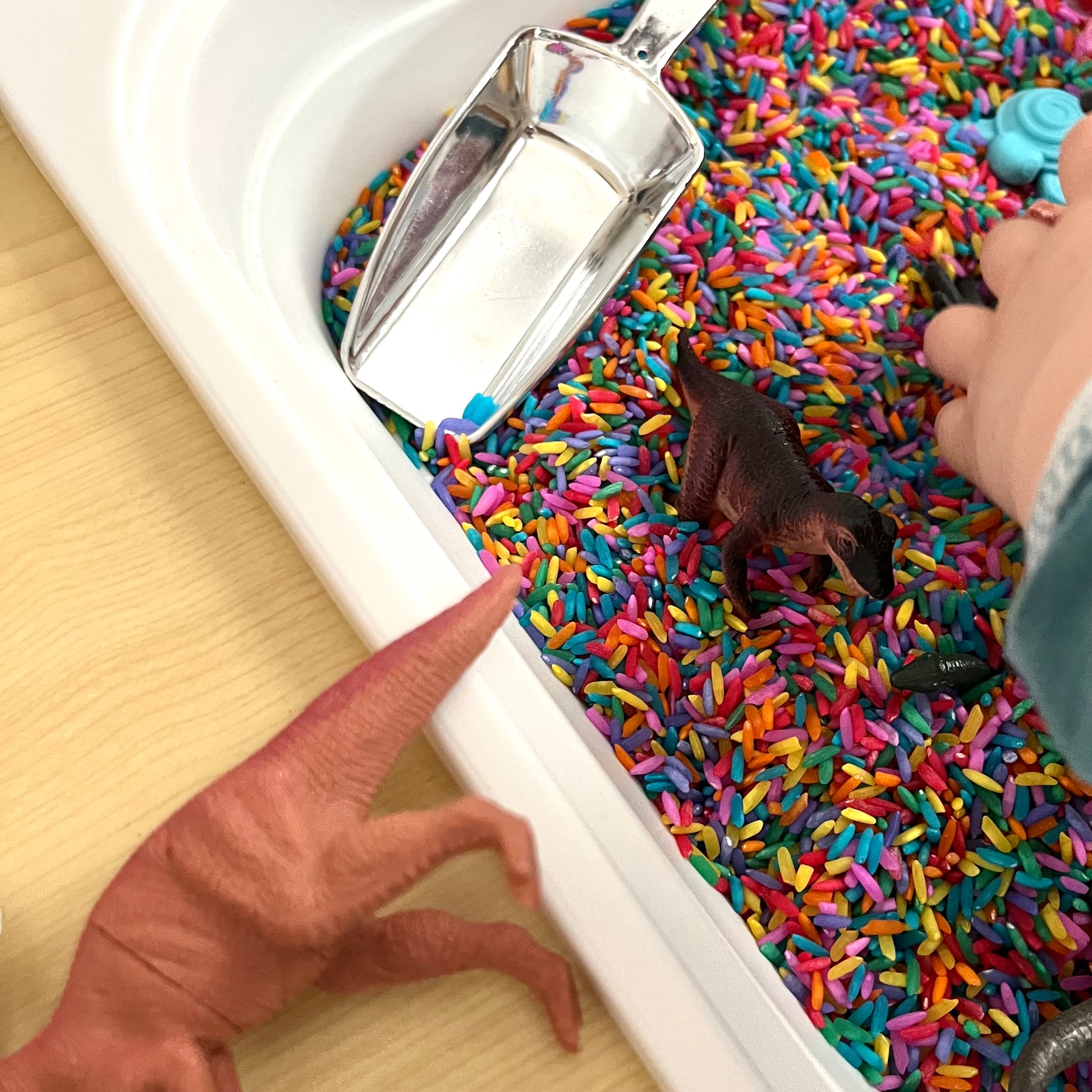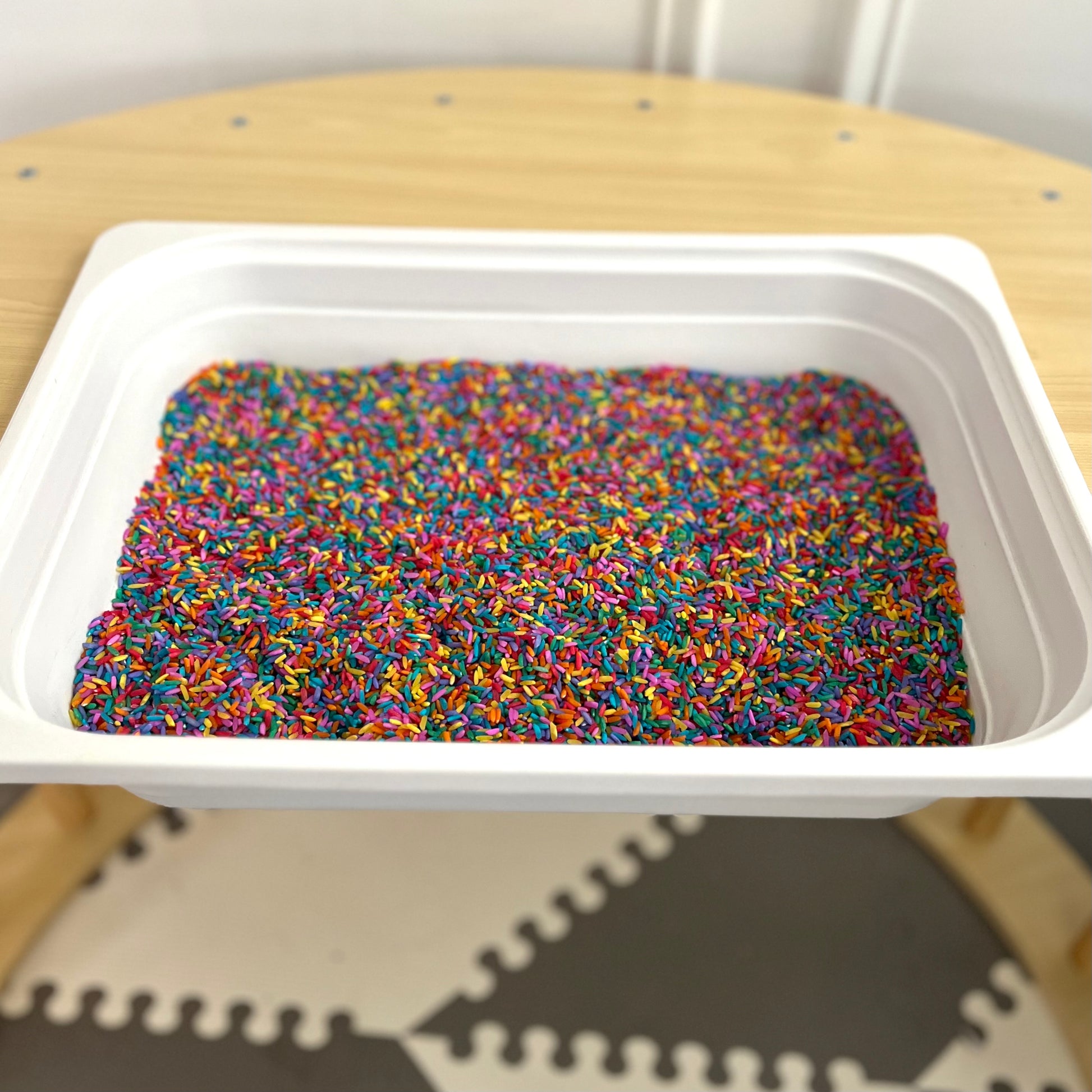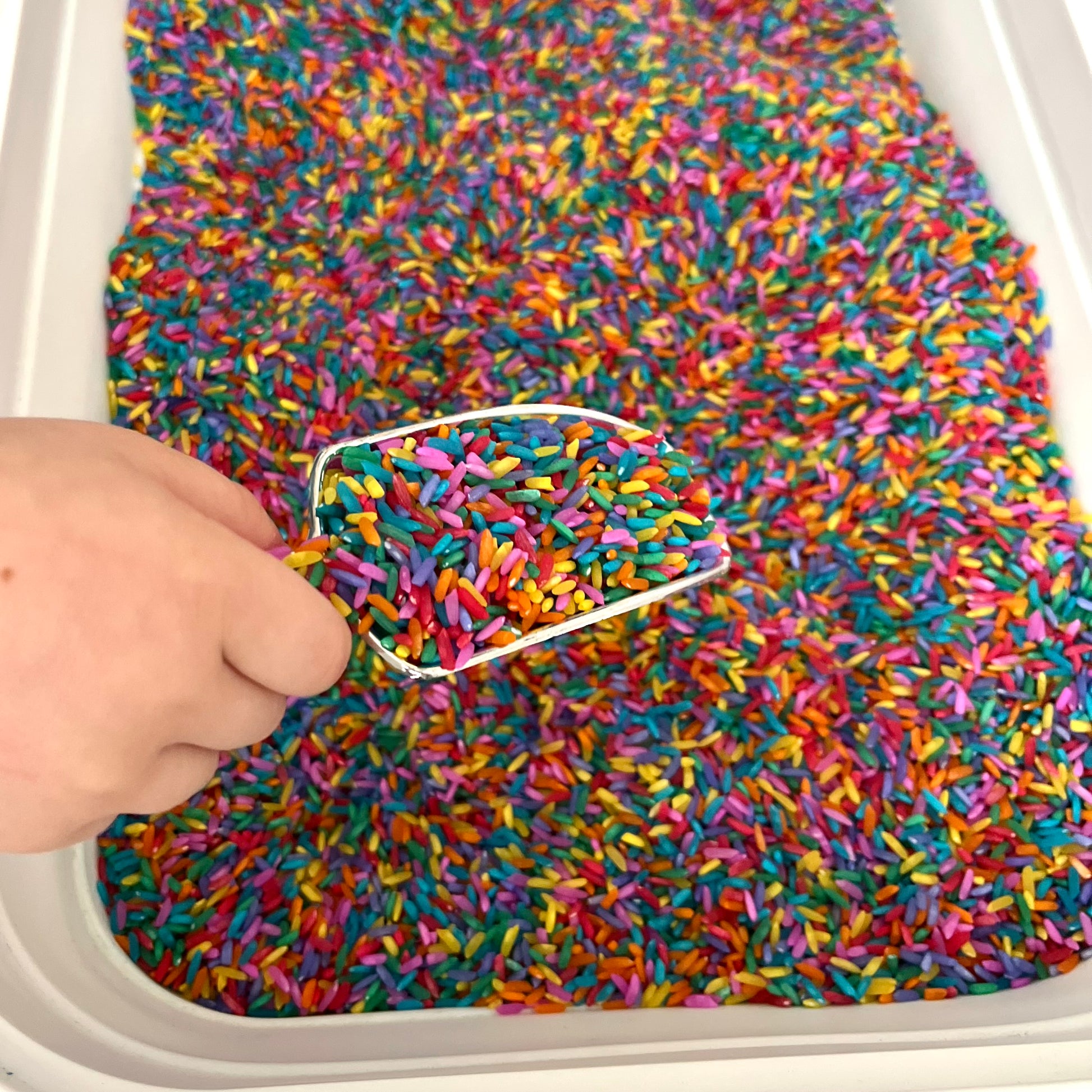 *Rice is dyed with liquid watercolor. Do not play with or in water. Dye may come off on hands if hands are wet